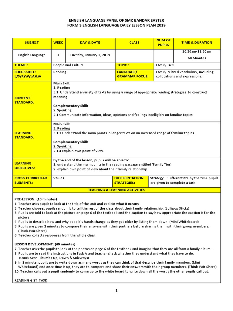 Lesson Plan Form 1 English Lesson Plan Educational Psychology