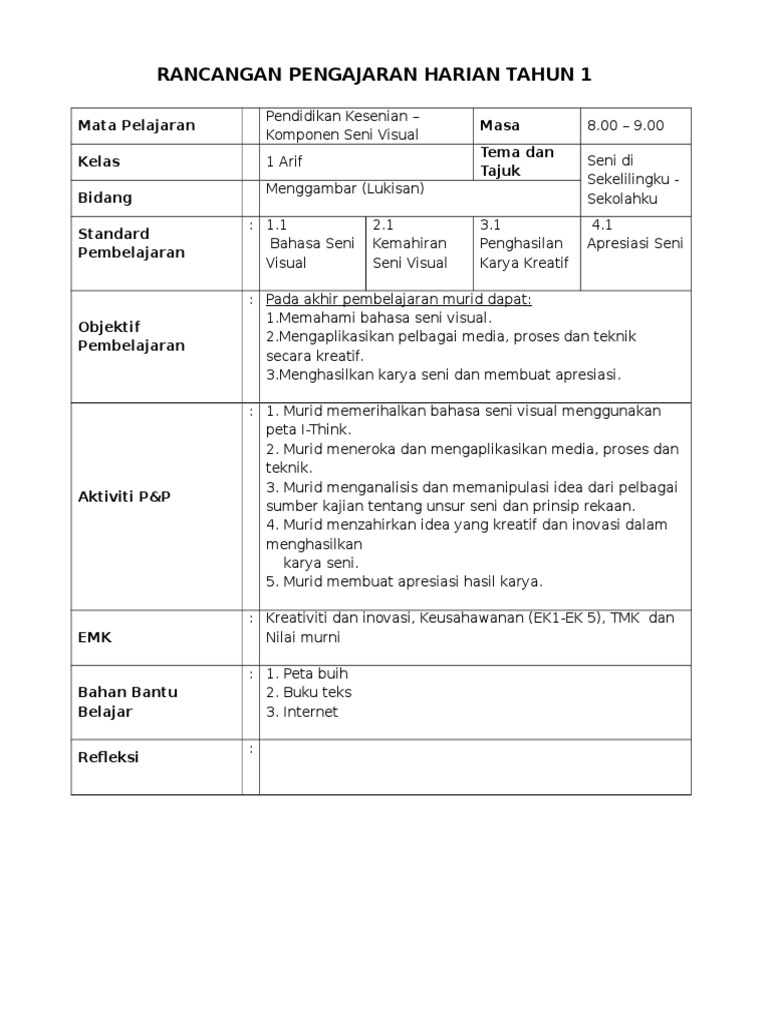 Doc Rancangan Pengajaran Harian Pendidikan Seni Visual Bil Perkara Dyana Nonong Academia Edu