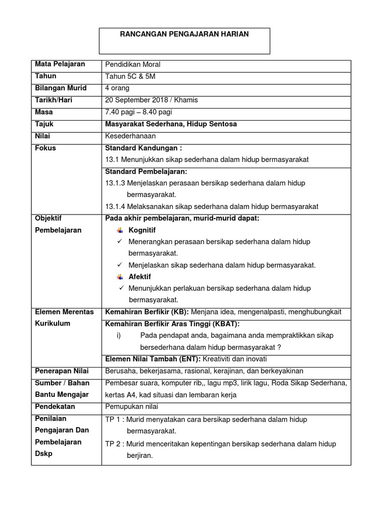 Download Rpt Pendidikan Moral Tingkatan 3 Terbaik Templat Rancangan Pengajaran Harian Rph Pembelajaran Abad Ke 21 Skoloh