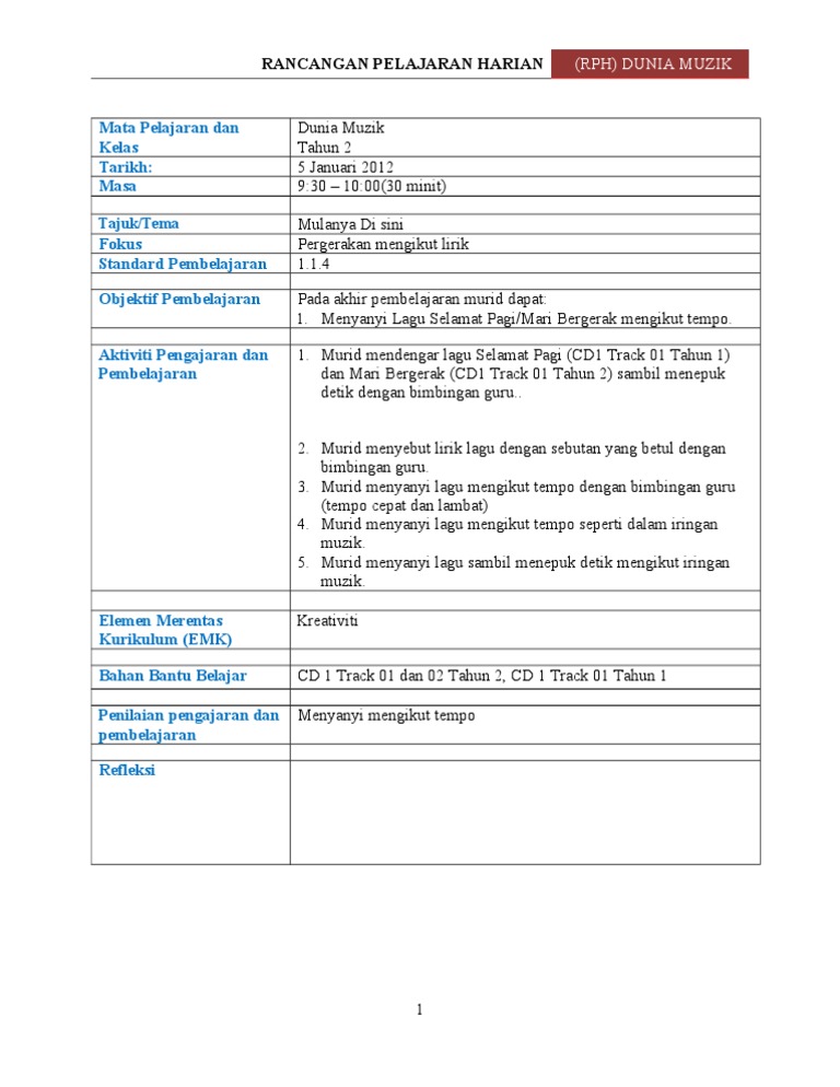 Rancangan Pengajaran Pendidikan Muzik Kbsr Tahun 3 Mata Pelajaran Pendidikan Muzik Tahun 3 Ledang Bilangan Murid Screenshots