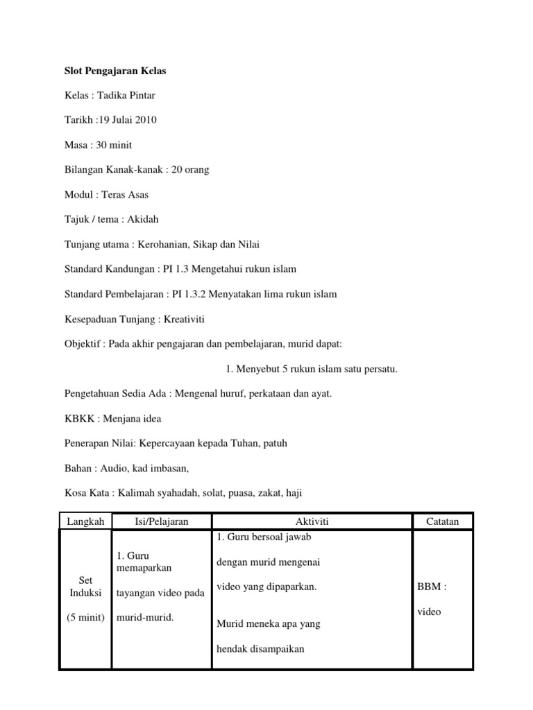 Rancangan Pengajaran Harian Pendidikan Islam Pra Sekolah