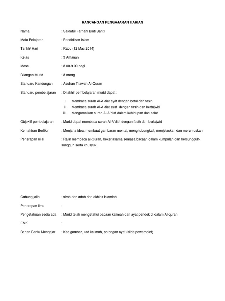 Rancangan Pengajaran Harian Pendidikan Islam Tahun 2