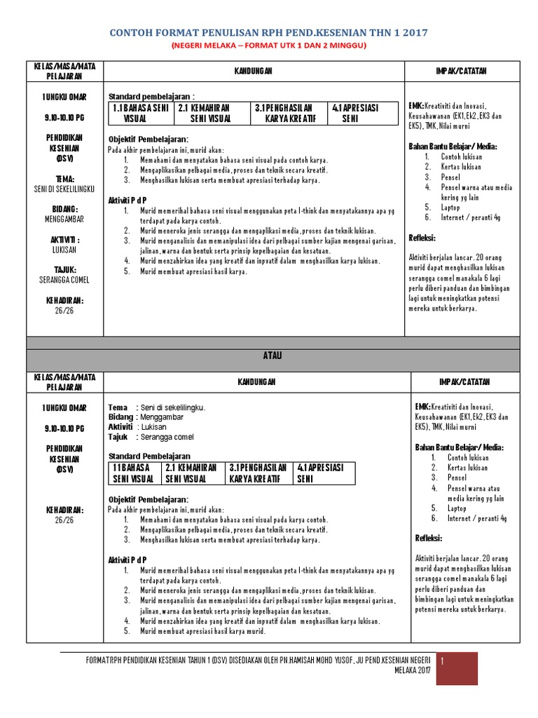 Catatan Guru Besar Rph Pendidikan Kesenian Tahun 1 Kssr 2017