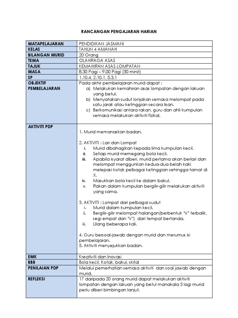 Rph pj tahun 4. Rph pendidikan jasmani tahun 4 adalah rancangan pengajaran harian yang perlu disediakan lebih awal oleh guru sebelum menjalankan sesi pegajaran dan pembelajaran rancangan pengajaran harian ini dibina sebagai panduan para guru untuk mengajar dengan lebih sistematik dan efektif serta mampu untuk mencapai apa yang diobjektifkan dalam sesi pengajaran dan pembelajaran kelak. Rph pendidikan jasmani tahun 4 contoh rancangan pengajaran harian pendidikan jasmani. Namun dah memadai untuk digunakan di awal persekolahan.