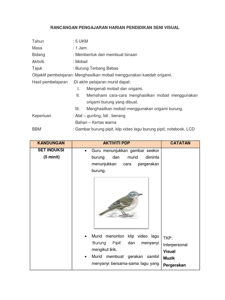 Contoh Rancangan Pengajaran Harian Pendidikan Seni Visual Tahun 3