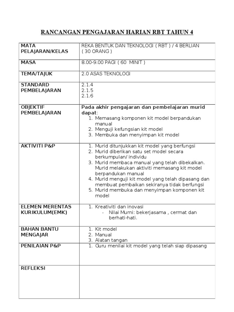 Rph Rbt Tahun 4 Docx Rancangan Pengajaran Harian T4 Kelas Tajuk Standard Kandungan Standard Pembelajaran Objektif Pembelajaran Ringkasan Kemahiran Course Hero