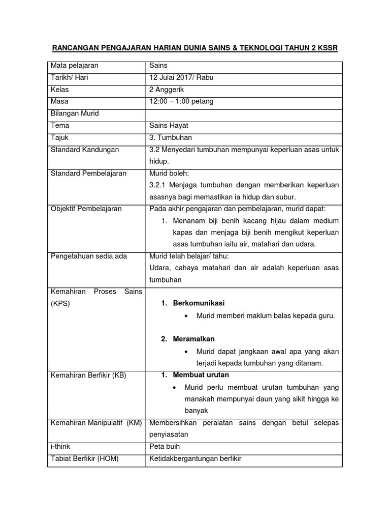 Rph Tahun 1 Kssr Rancangan Mengajar Tahun 1 Dunia Sains Dan Teknologi