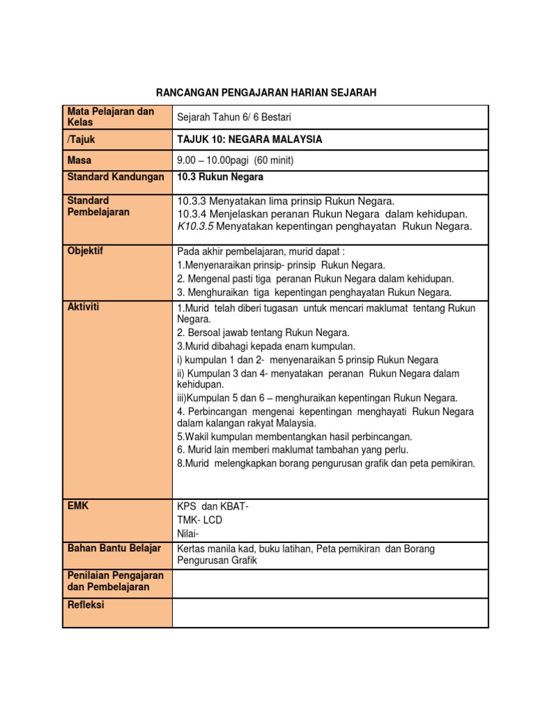 Rancangan Pengajaran Harian Sejarah Tahun 6