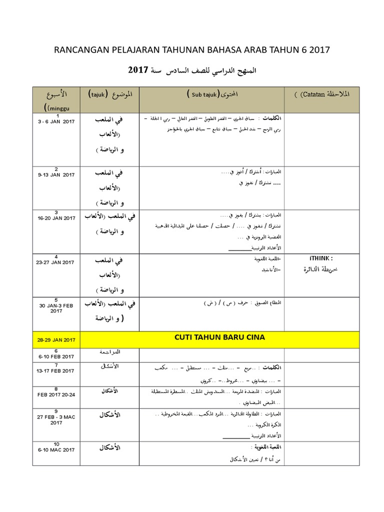 Rancangan Pelajaran Tahunan Bahasa Arab Tahun 6 2017