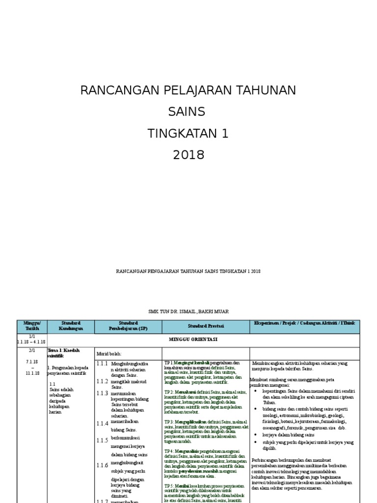 Rancangan Pengajaran Tahunan Sains Tingkatan 1 2018