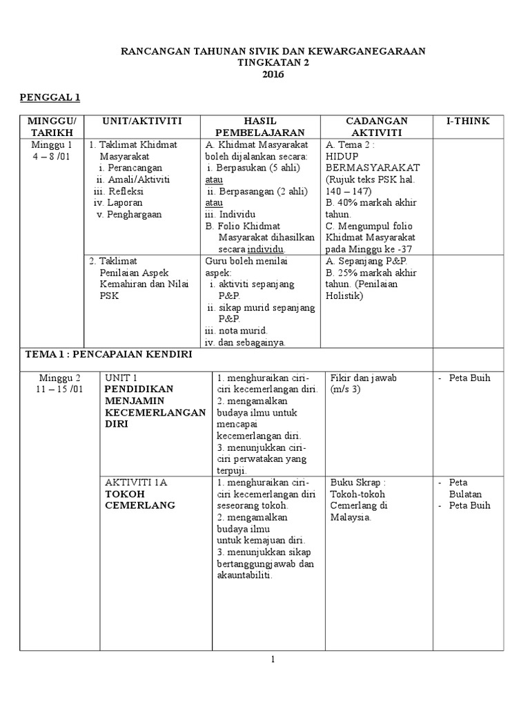 Rancangan Tahunan Pendidikan Sivik Dan Kewarganegaraan Tingkatan Satu