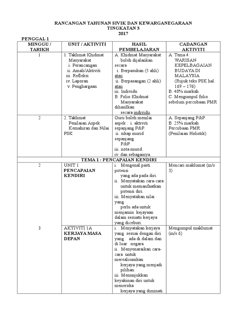 Rancangan Tahunan Sivik Dan Kewarganegaraan Tingkatan 3 2017 Penggal 1 Minggu Tarikh Unit Aktiviti Hasil Pembelajaran Cadangan Aktiviti