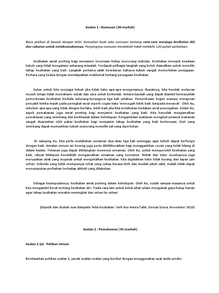 Maka jika diri kita orang. Rumusan 30 markah baca petikan di bawah dengan teliti kemudian buat satu rumusan tentang cara cara menjaga kesihatan diri dan cabaran untuk melaksanakannya. Kita juga mestilah mencuci rambut menggunakan syampu untuk mengelakkan rambut.