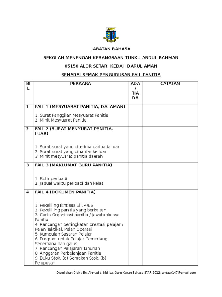 Doc Senarai Semak Isi Kandungan Fail Panitia Mata Pelajaran Panitia Fazila Wati Academia Edu