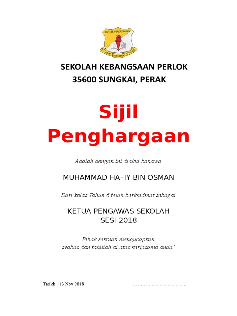 Sijil Penghargaan Pengawas Pss Cute766
