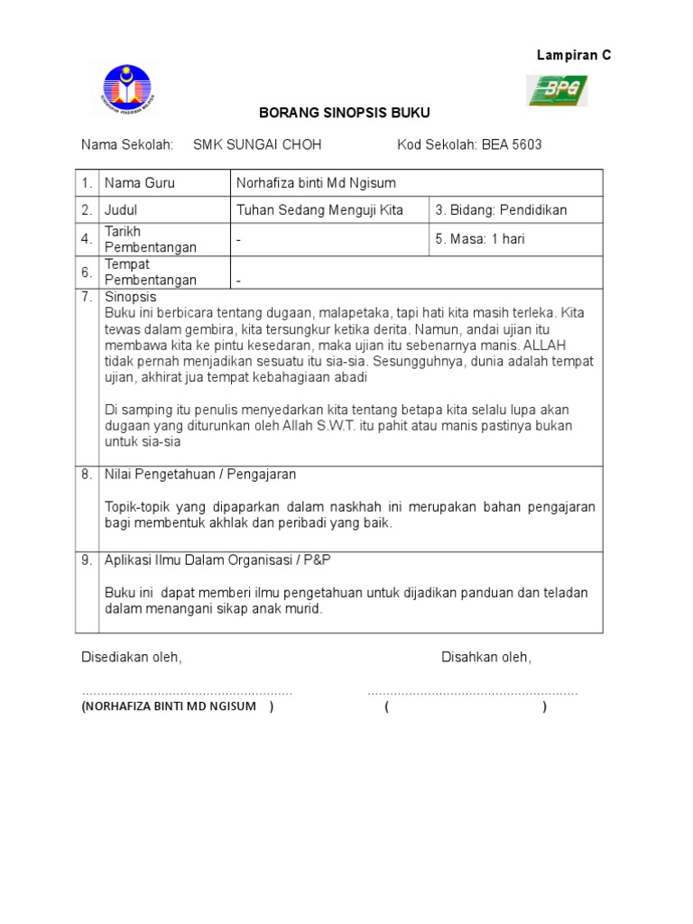 87842623 Borang Sinopsis Buku Untuk Guru Doc Lampiran C Borang Sinopsis Buku Nama Sekolah Smk Kapit Kod Sekolah Yee 7101 1 2 Nama Guru Judul 4 6 7 Course Hero