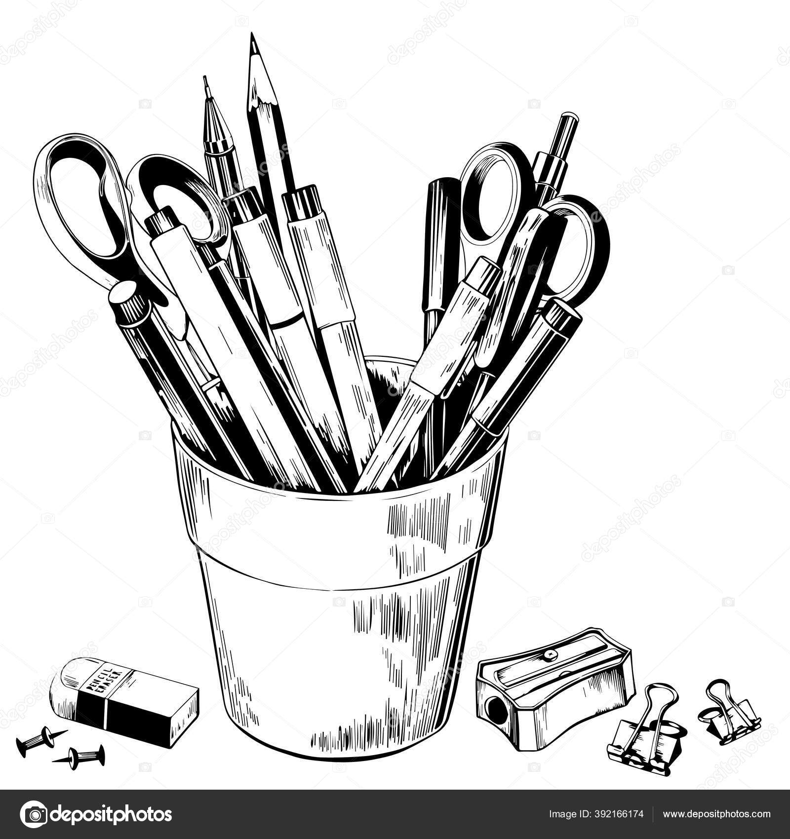 Pensil Dan Pena Pada Pemegang Yang Diisolasi Pada Latar Belakang Putih Stok Vektor C Jeannadraw 392166174