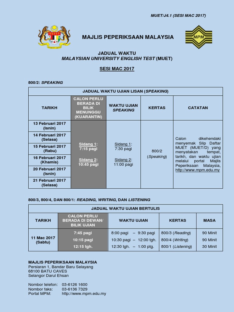 Kalendar Peperiksaan Muet 2017 Mpm Kisah Viral Malaysia Terkini