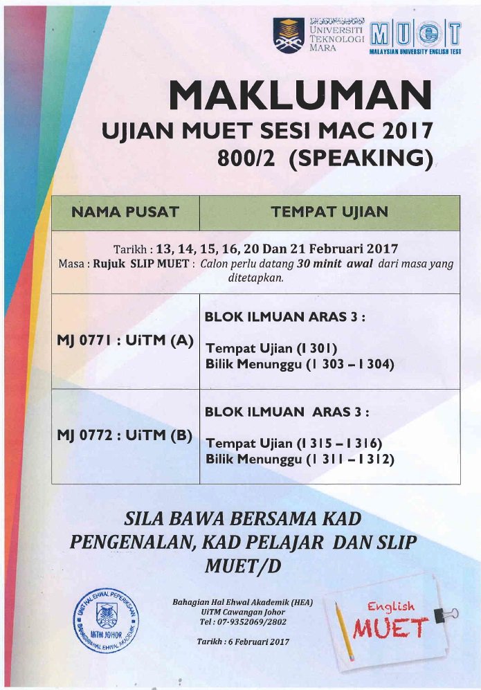 Hea Uitm Johor On Twitter Perhatian Pelajar Diploma Uitm Cawangan Johor Yang Memohon Menduduki Ujian Muet Mac 2017 Di Uitm Cawangan Johor Kampus Segamat Https T Co Y2myfppfad