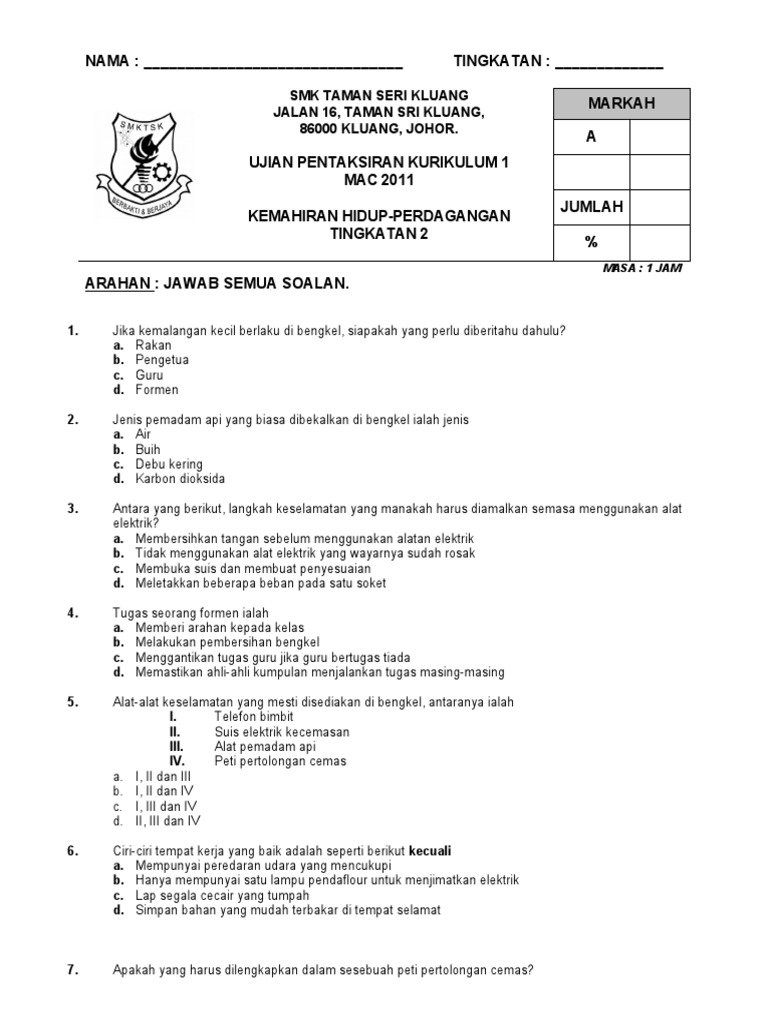 Soalan Kemahiran Hidup Tingkatan 2 Pt3